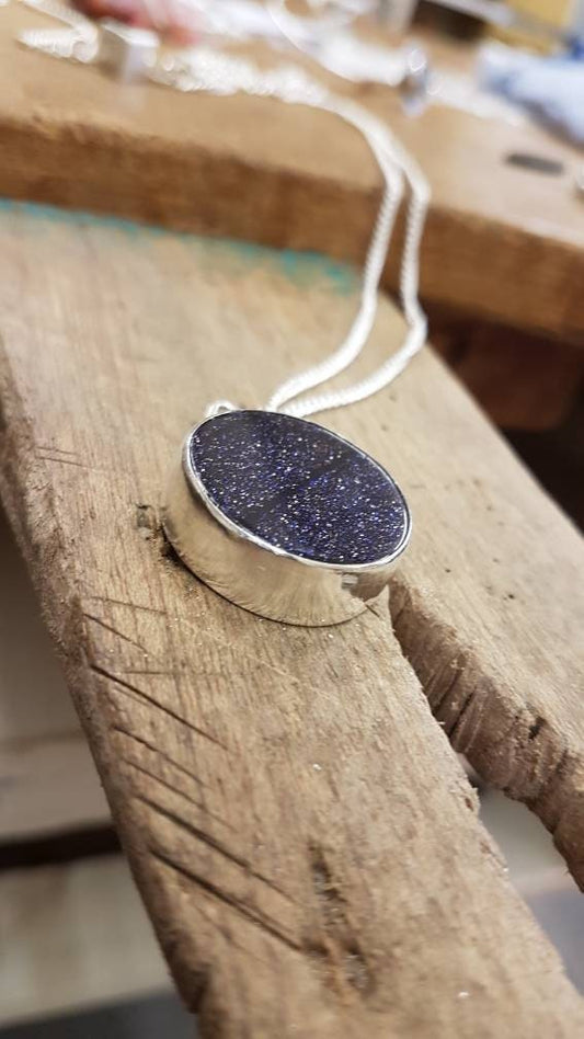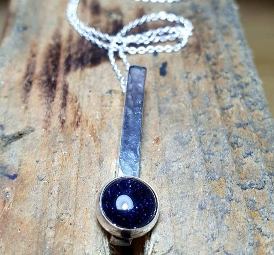 Blue Goldstone Sterling Silver Hammered Bar Pendant